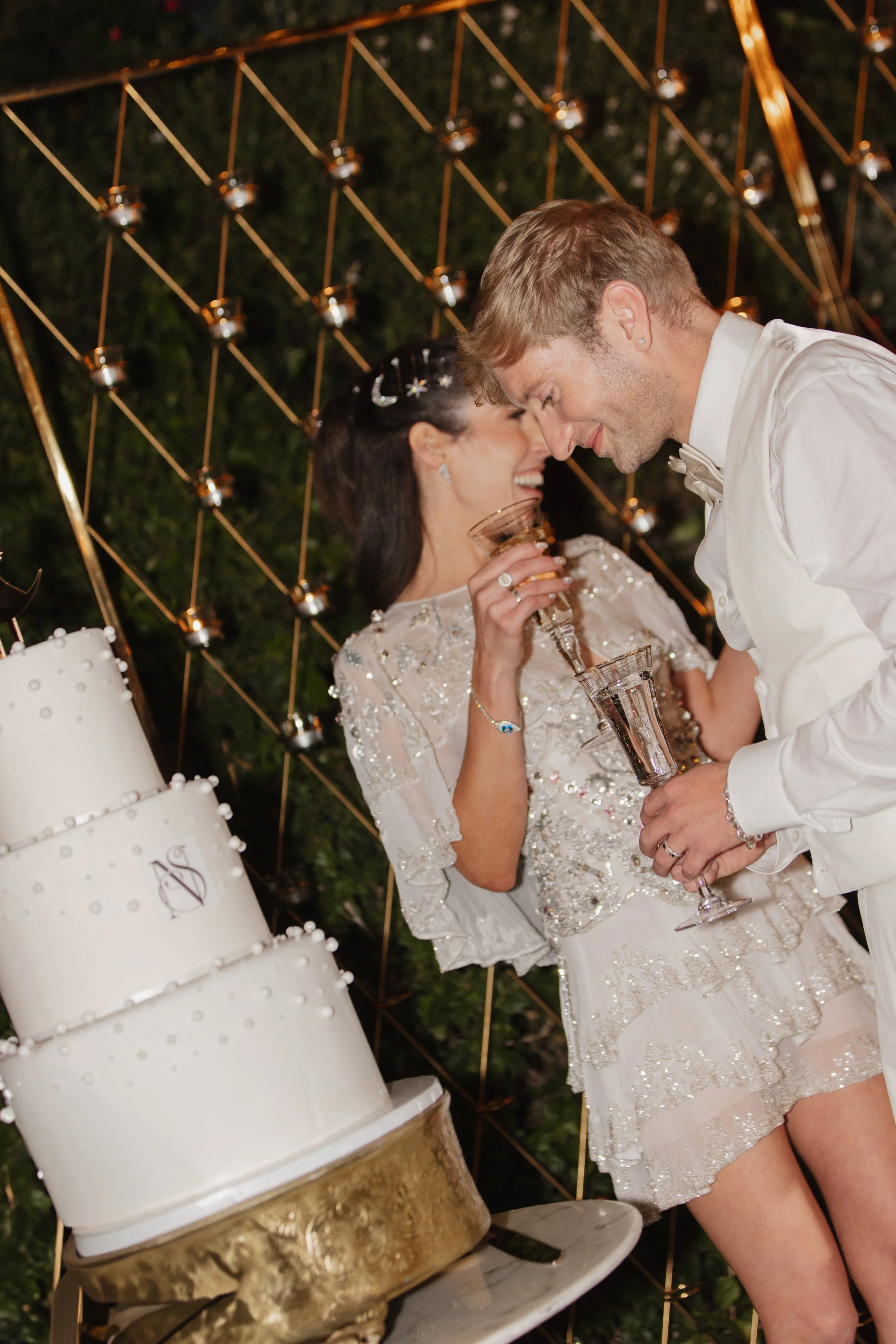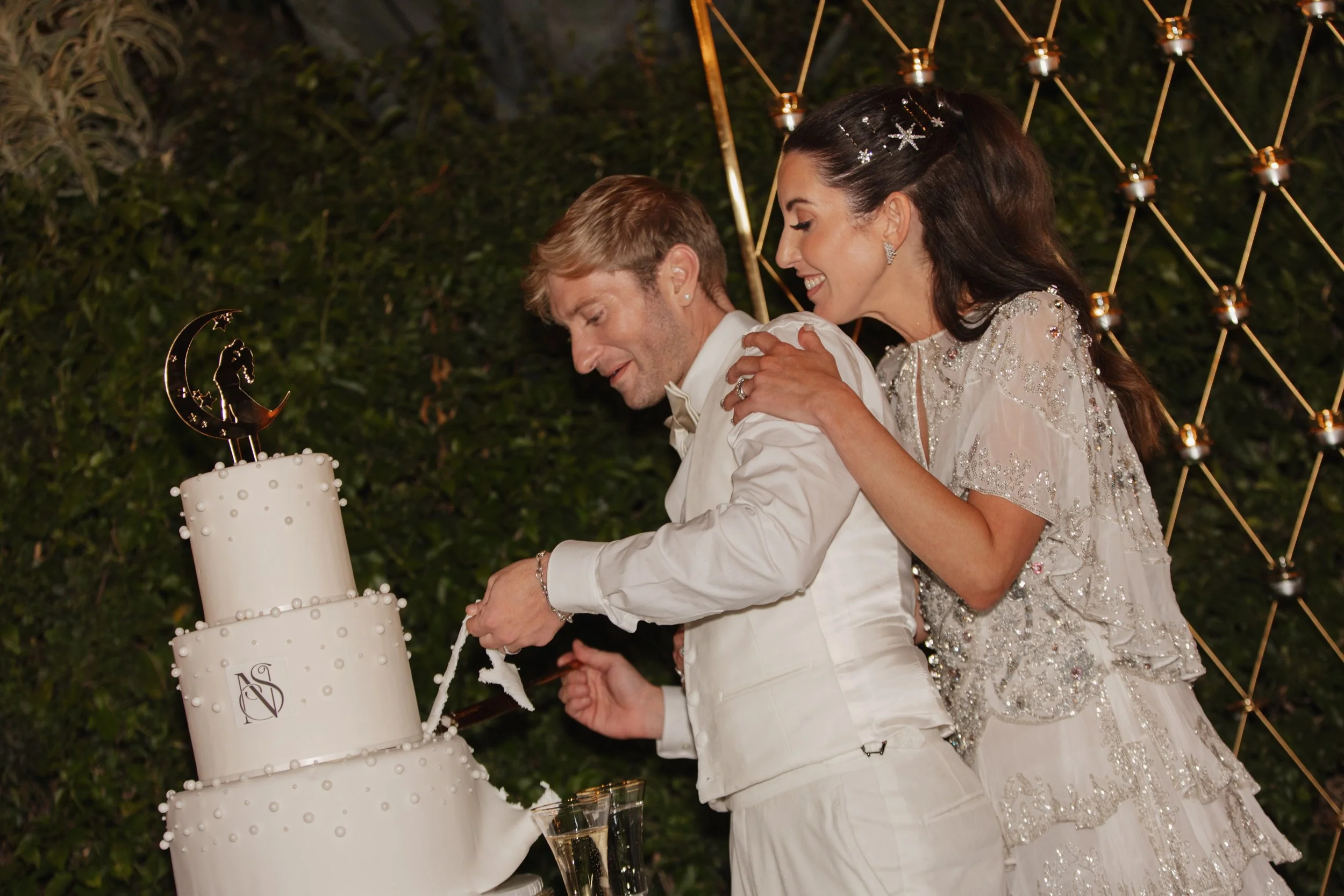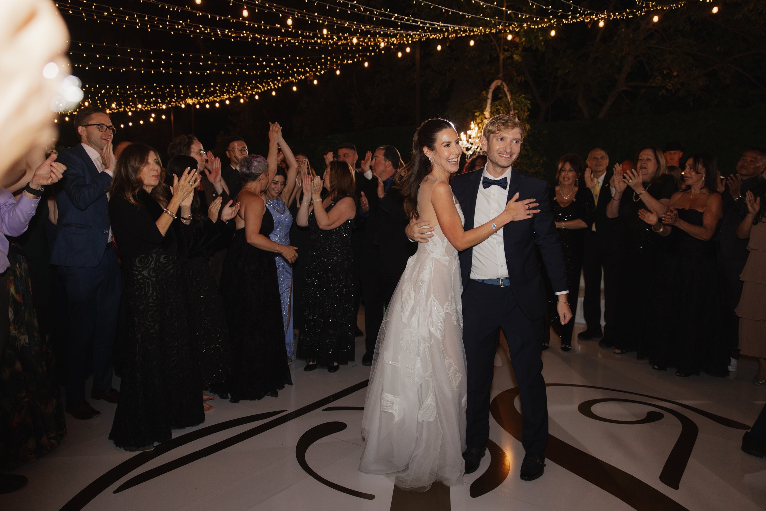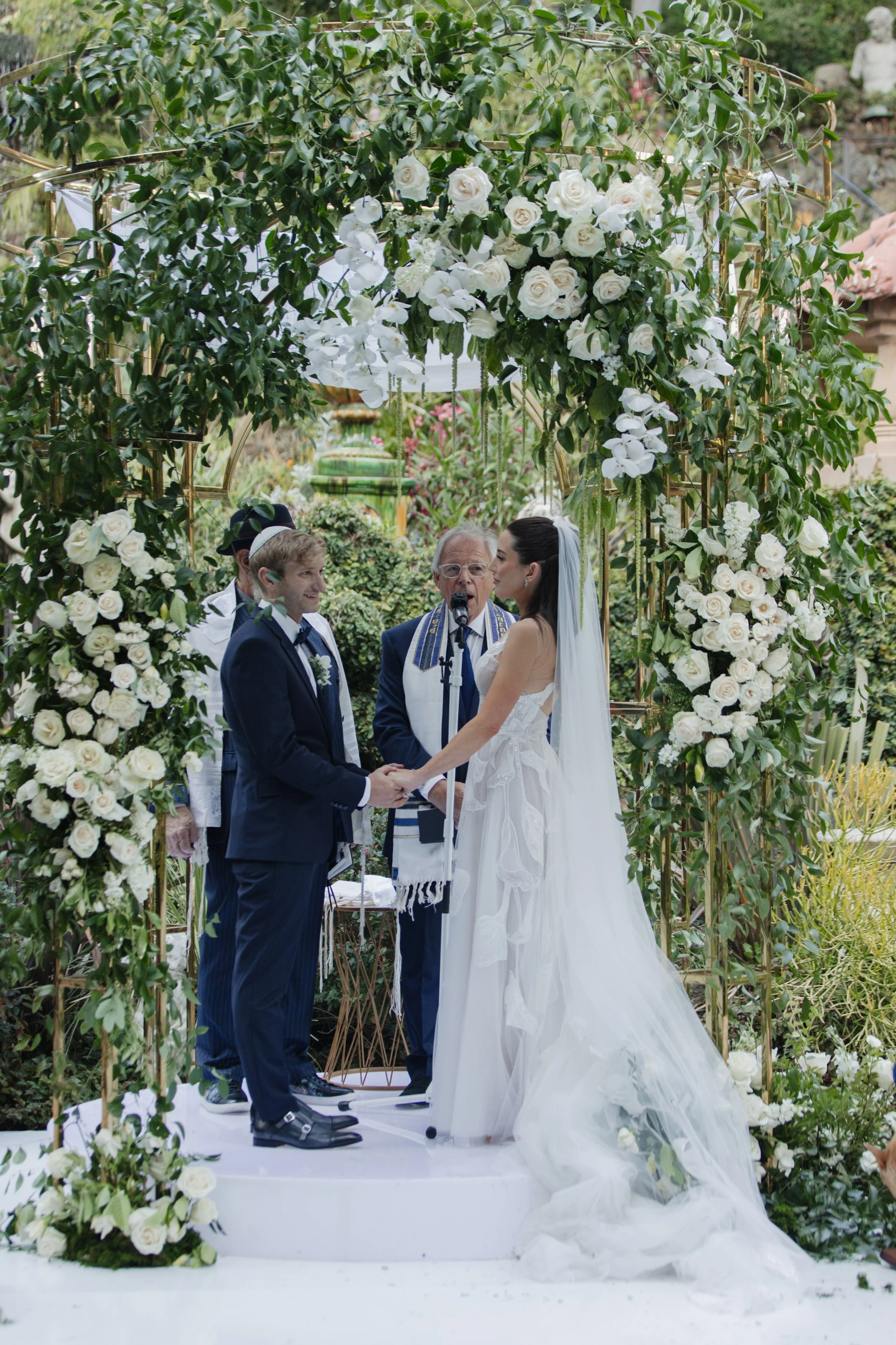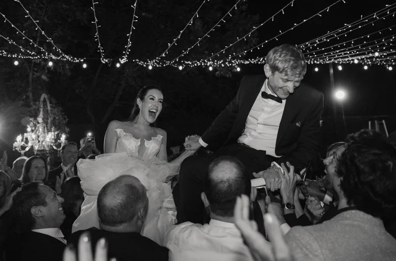 The ceremony unfolded on one of the estate's open terraces, a chuppah draped in florals framing the couple against a canvas of California sky. There's something about a Jewish wedding ceremony that carries such beautiful intentionality — the vows feel anchored, the rituals feel full of meaning, and the moment the glass shatters and the crowd erupts in "Mazel Tov!" is one of the most purely joyful sounds you'll ever witness.