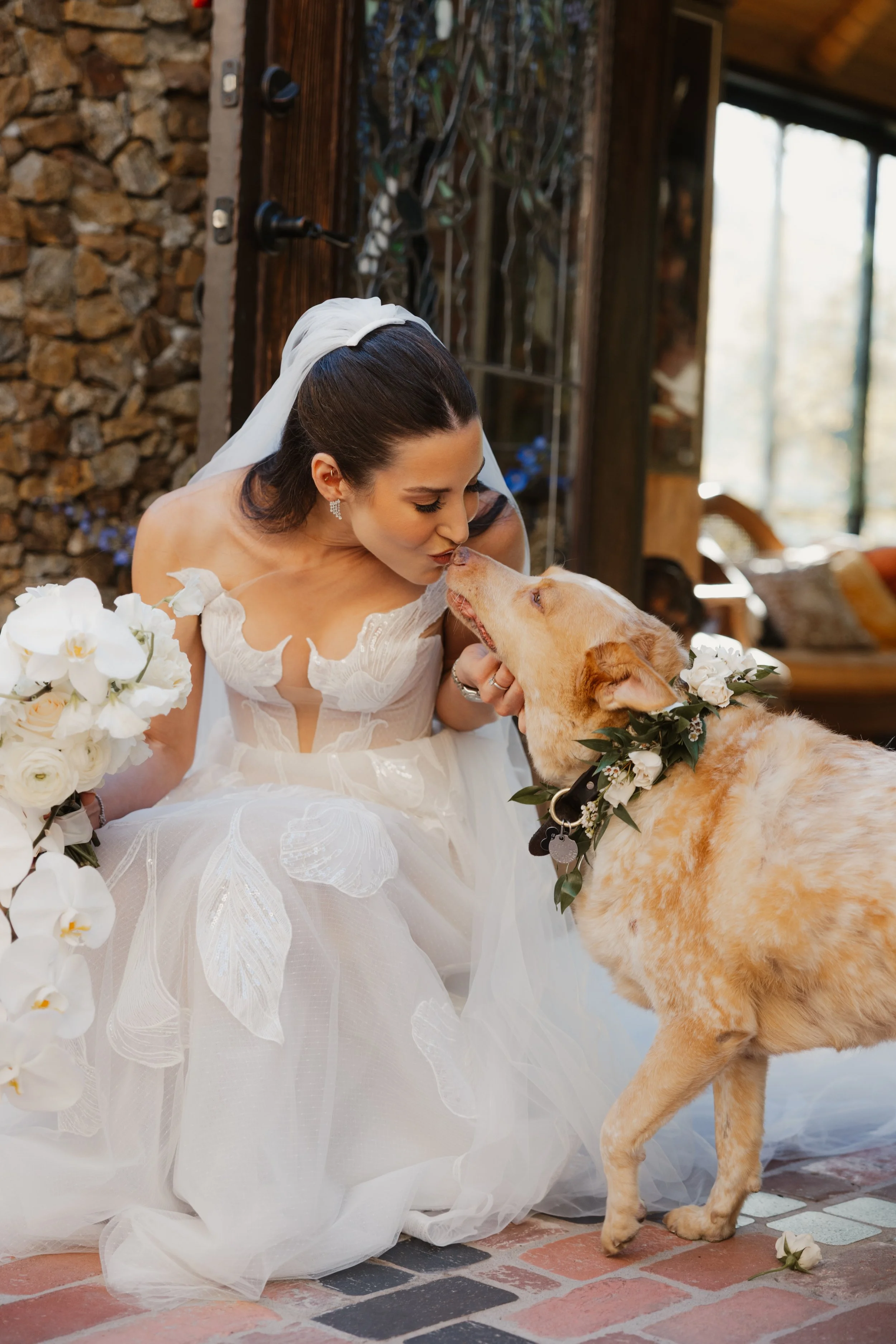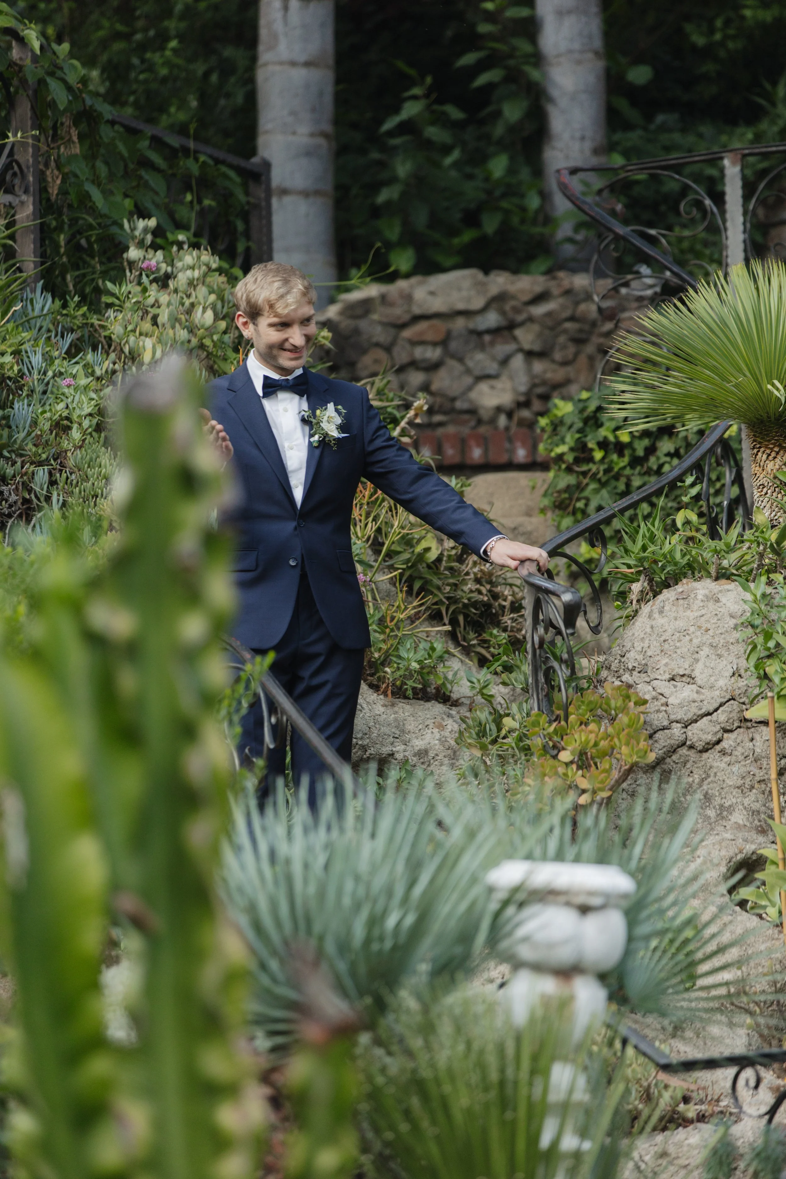 We snuck away for portraits just as the sun began its descent over the hills. The light at Houdini Estate during golden hour is something I genuinely cannot overstate. It pours through the eucalyptus trees in warm, honeyed shafts, catching on every surface — on her earrings, on the stone walls, on the white of his shirt. We wandered the gardens, laughed, and captured images that look like they belong in an editorial spread.