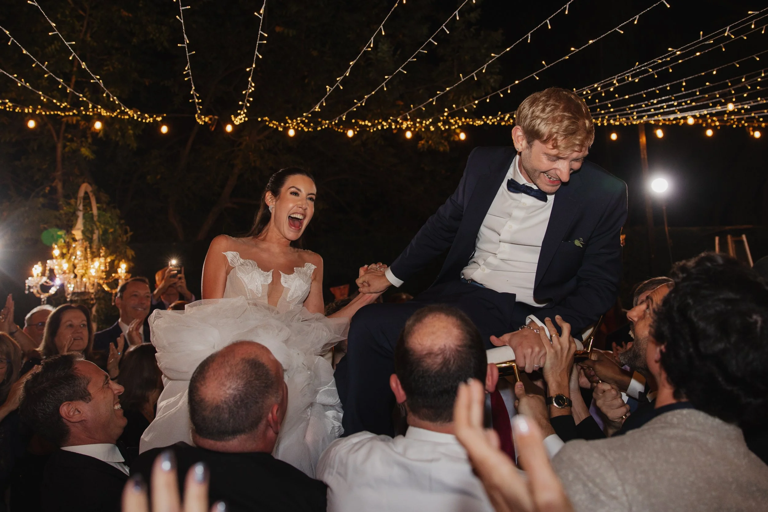 If the ceremony was emotion, the reception was pure energy. This crowd did not hold back. The hora started within minutes of dinner and didn't stop — chairs were lifted, arms were linked, the music was impossibly joyful. The dance floor was packed from the first song to the last, with every generation out there dancing together.